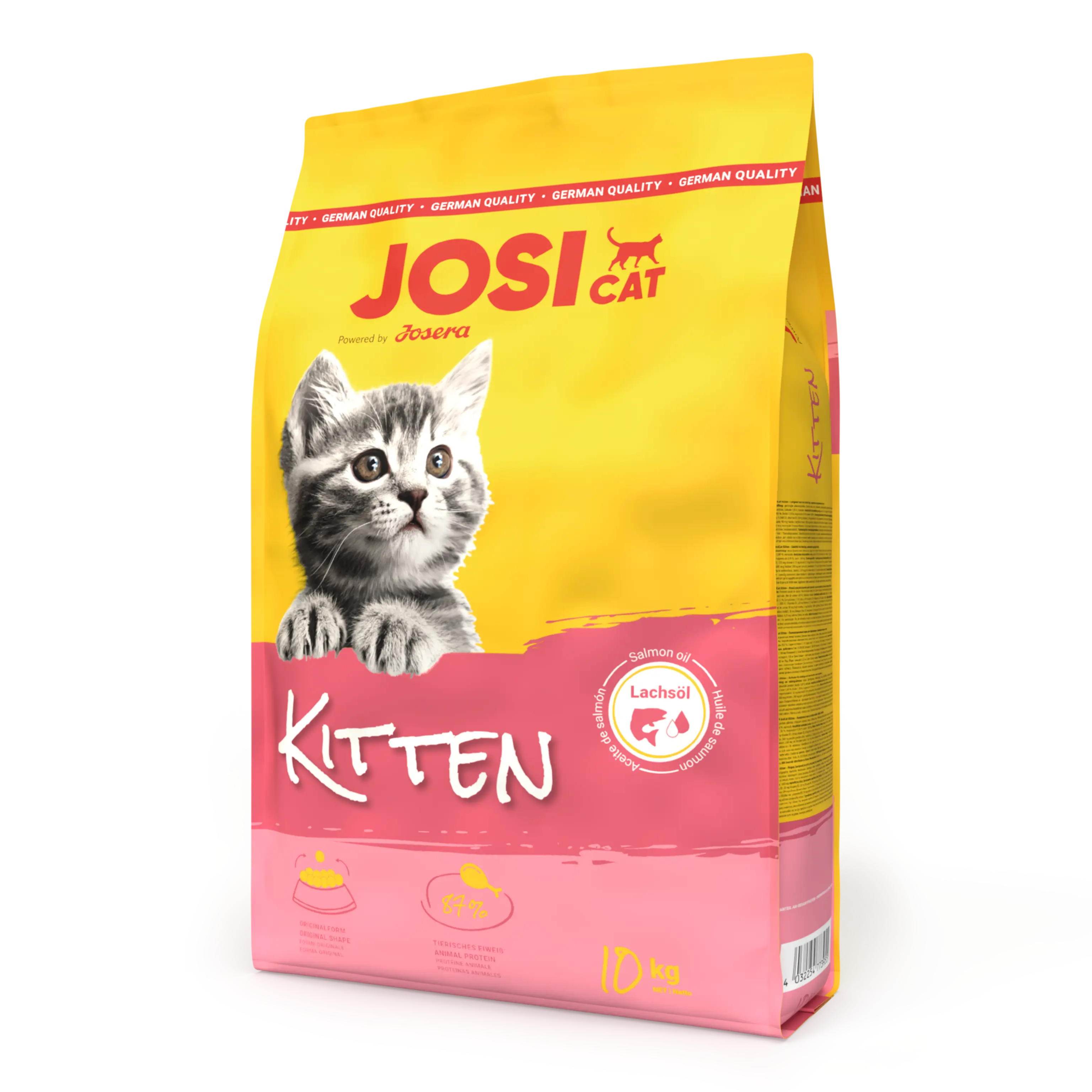 Something ingenious for your little feline friend? It doesn't have to be complicated: our JosiCat Kitten dry food supplies all the important nutrients your kitten needs right from the start to grow big and strong. It also offers impressive value for money. The recipe is designed with delicious flavour in mind. And salmon oil provides valuable omega-3 fatty acids, which contribute to a shiny, silky coat thanks to essential trace elements and vitamins. The high calorific content and balanced nutrient complex are designed to meet the specific needs of younger cats and promote optimal development.
